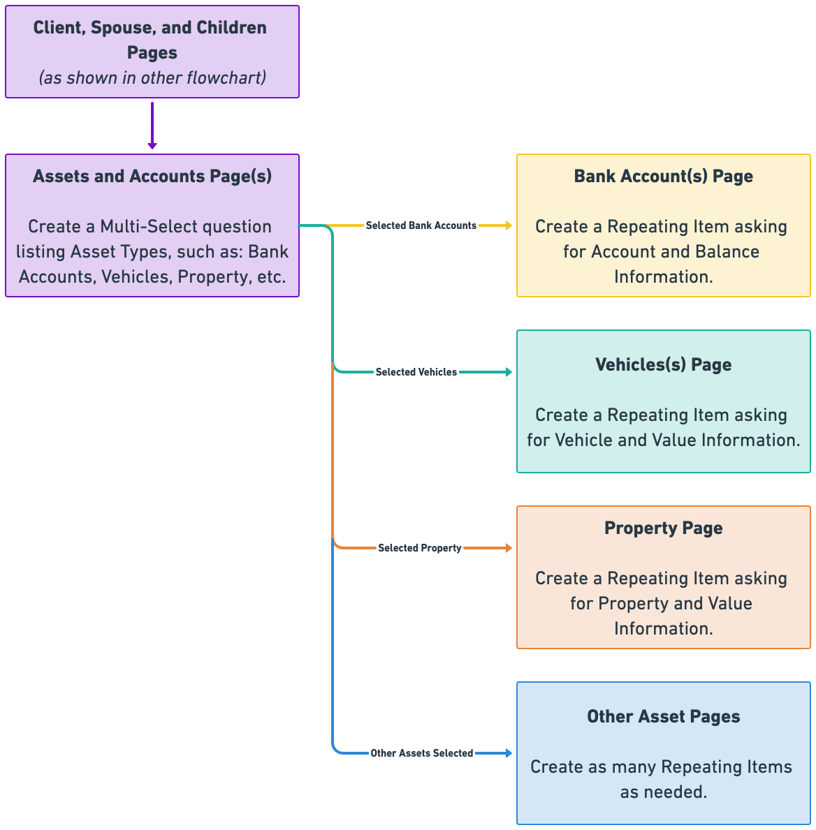 - Add logic to questions that are conditional (e.g., spouse name only appears if marital status is “married”) and page logic to any conditional pages (e.g., “children info” only appears if they have children).